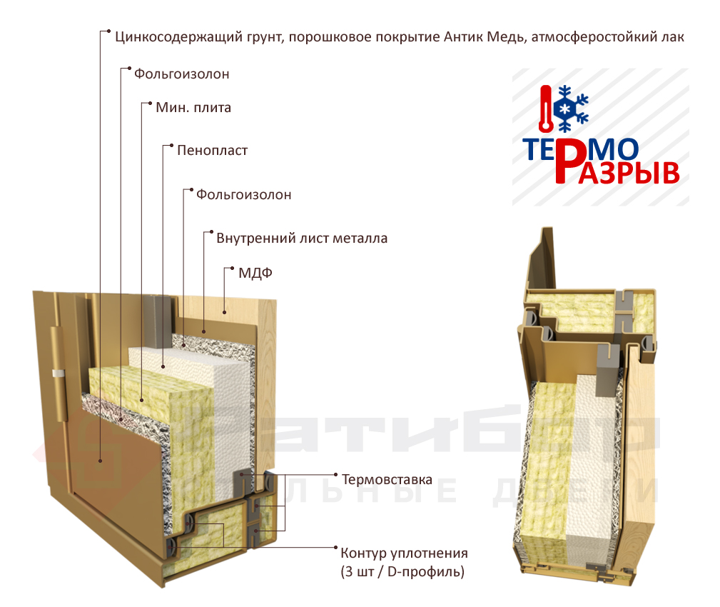 цельногнутая конструкция полотна и коробки, терморазрыв на полотне и дверной коробке, эксцентрик, замкнутая утепленная дверная коробка. Толщина металла на полотне и коробе двери с полимерным покрытием 1,8мм. |